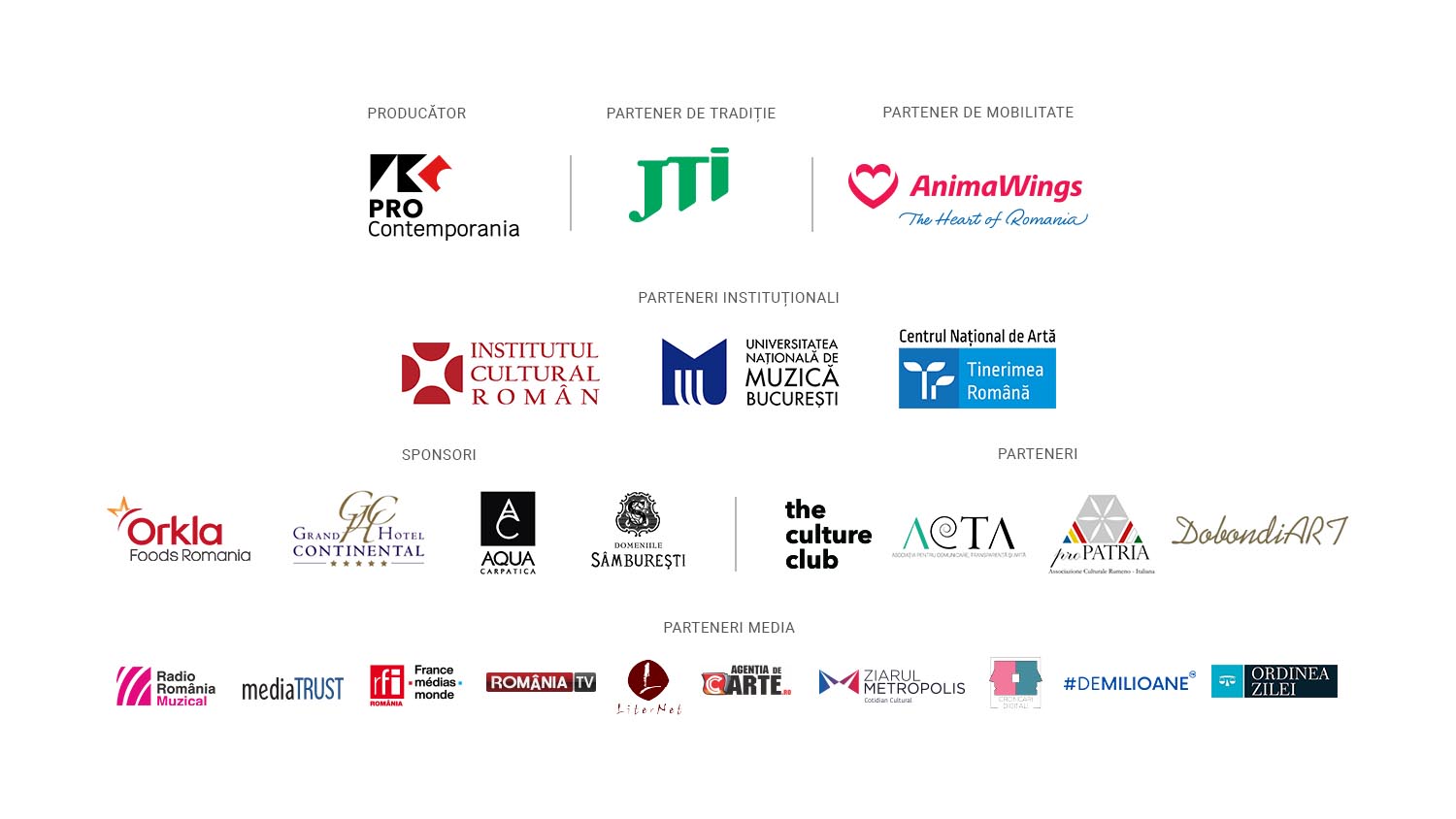 Parteneri instituţionali : Institutul Cultural Român, Universitatea Naţională de Muzică din Bucureşti, Centrul Naţional de Artă Tinerimea Română